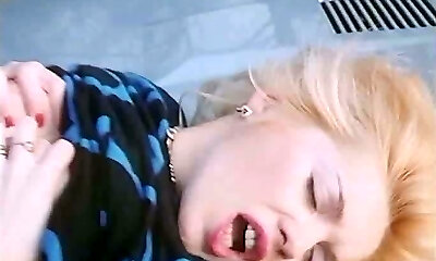 Super-cute towheaded girl is amazed with the size of dude's dick